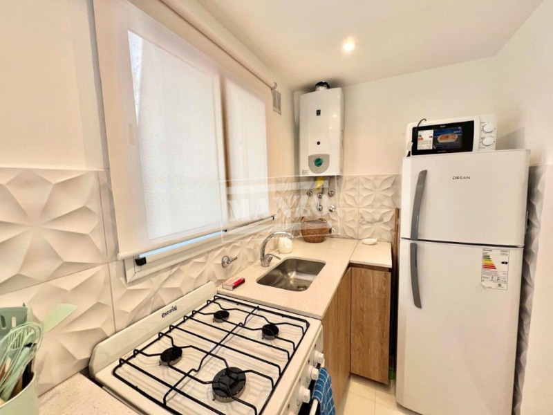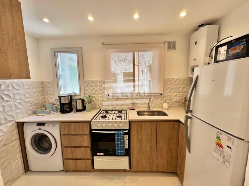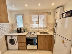 Cocina equipada con heladera con freezer, microondas y lavarropas.